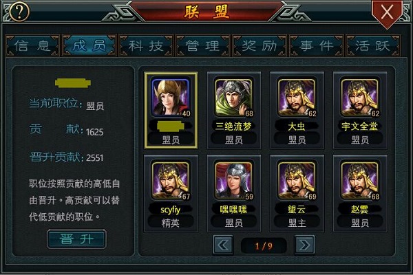 点击详细的联盟成员清单,可进行自己职位的提升,或是加强与其他联盟成员的互动联系。