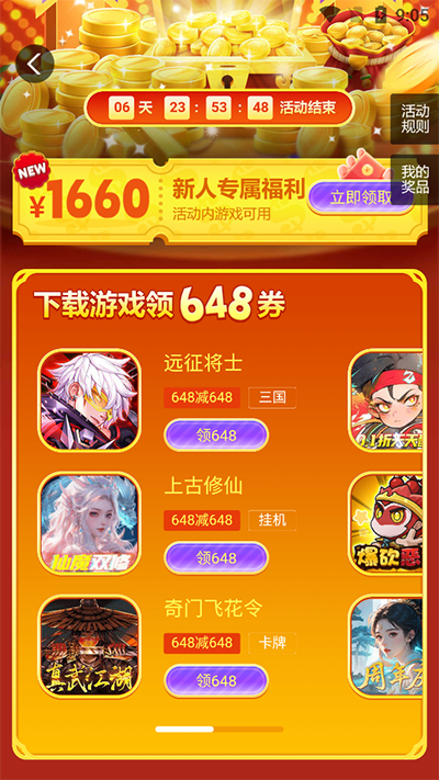 4、还有海量新人福利,下载游戏领648券