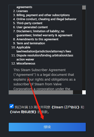 6、接着勾选同意协议条款,并点击“继续”;