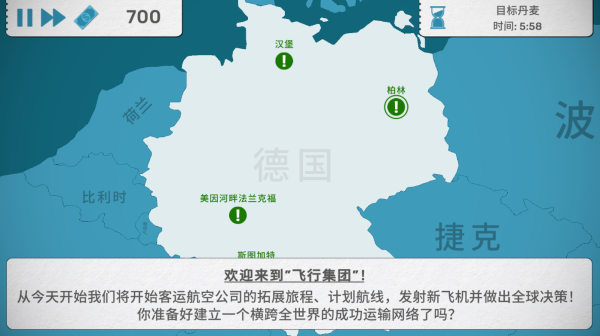 1、我们需要做的是通过手指连线的方式,在城市之间建立航空路线,航班到达时将会给对应城市带来客流,同时也会增加收入。在挑战模式下,我们需要每6分钟就要解锁一个新国家的航线,而解锁新国家需要资金,这就需要我们合理规划航线,并且适当升级需求市场较高的机场,提升载客量来快速增加收入,同时随着游戏的推进,在解锁国家内也会自动解开城市机场,将其连到我们的航空网络即可。