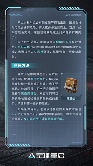 想在《星球:重启》的世界中健康长久地生存下去,学会寻找食材并对其进行烹饪加工是必不可少的。本期生存指南将会给大家详细介绍如何辨认食材、如何获取食材及如何烹饪,各位幸存者一定要仔细阅读,努力做出饱腹又美味的食物哦!