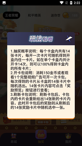 4、点击屏幕底部抽奖,可以选择金币开卡包或者看视频开卡包来抽取皮肤碎片。