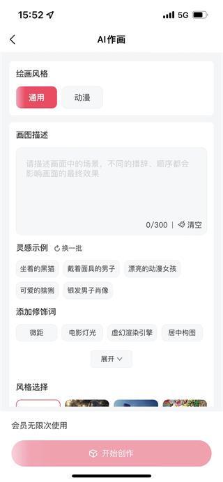 3、还可以进行“风格选择”,也可以选择喜欢的艺术家的画风;选择好后点击“开始创作”