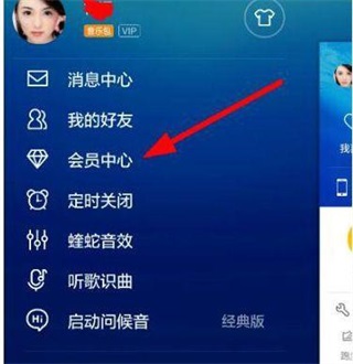 打开酷狗手机客户端,左滑,进入个人中心,选择第三项“会员中心”。