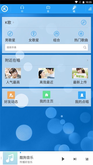 酷狗电台以语言、场景、人群、心情、风格、综艺等不同类别划分。每个独立电台都拥有大量的精选歌曲。电台的歌曲切换采取随机播放形式,重复播放率低。专业音效、智能打分,依托酷狗正版曲库,高品质伴奏任供用户挑选。多种音效,个性化调音选项。直播互动、K房嗨唱,还能结识更多志同道合的歌友。
