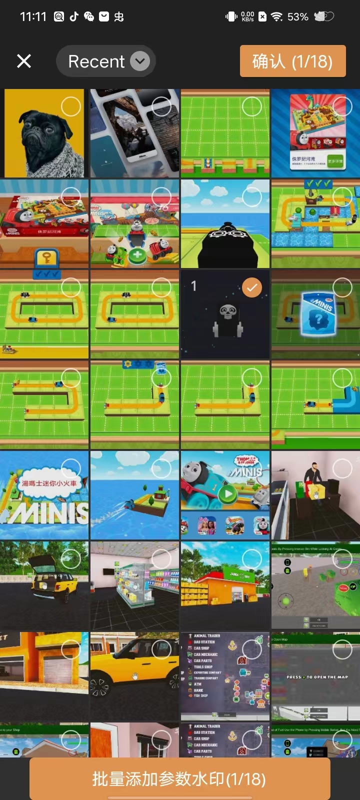 3、在水印板块中随意挑选一张,点进去,选择想要添加水印的照片,最多可以选择18张;