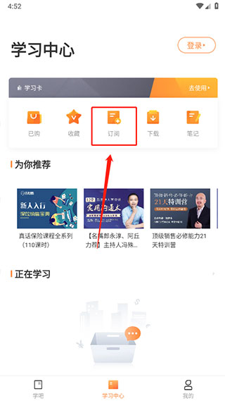 1、打开平安知鸟app,在【学习中心】界面选择“订阅”;