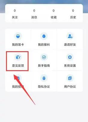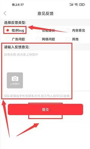 进入意见反馈界面,选择反馈类型、输入反馈内容、上传图片、联系方式,点击【提交】。