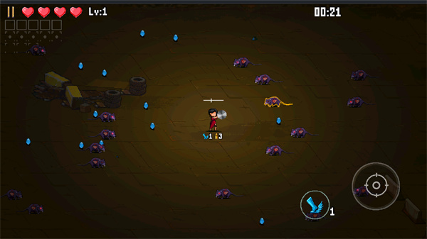 4、进入游戏后,玩家可以通过摇杆移动角色,点击鞋子样子的按钮可以躲避怪物,点击瞄准按钮进行射击;