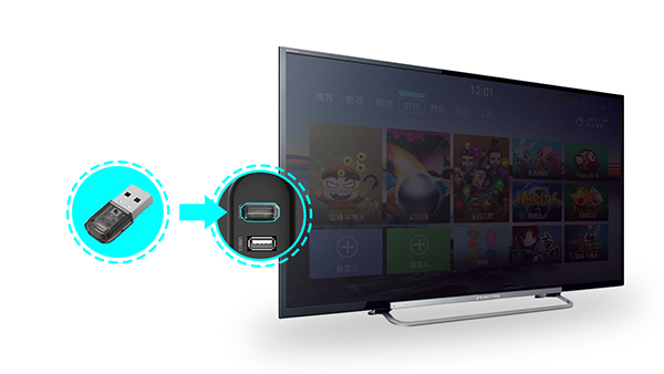 将无线接收器插入电视USB接囗后,轻按一下手柄的【北通LoGO键】开机,稍等片刻,即可自动配对连接。