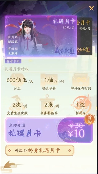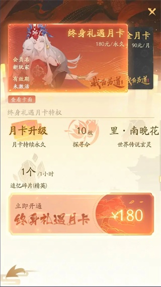 10个探寻令是一次性给的,但是月卡权益里说了每个月都会给一个探寻令!可以说是长期玩家必备!一个小tip:世界传说和主角也是精英品质,也就意味着碎片可以开出来!据测试体验,概率不低哦,当然,非酋例外。关于小月卡和终身的先后,强烈建议先小月卡,再终身。有返利!返利!就是你先买小月卡,再升级为终身会返你代金券。