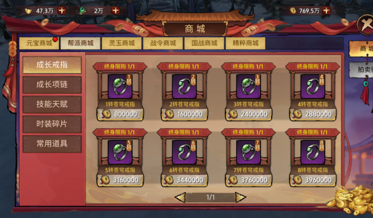 大侠们肯定迫不及待想要极品装备了,首先是我们的成长装备,成长戒指和成长项链,除了通过秘宝禁地刷元宝去商城购买,帮派商城也可以通过声望值进行兑换。