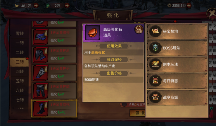 强化装备需要消耗强化石,提升一定等级后还需要高级强化石,通过一些副本和战令兑换就能获得,这边推荐秘宝禁地和BOSS玩法,除了能获得强化石,还可以得到大量经验和极品装备可谓是一举两得。