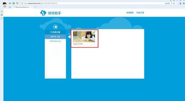 步骤二: 在电脑浏览器中输入 www.tvkuai.com 选择设备和文件进行上传;