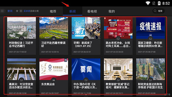 1、在央视新闻tv版中可以通过推荐、新闻、看电视、搜索等多种方式看直播,比如在新闻中可以看到有很多的直播内容,一键点击就可以进入观看;