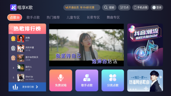 1、点歌台:热歌排行榜、免费试唱、分类点歌、每日一曲等