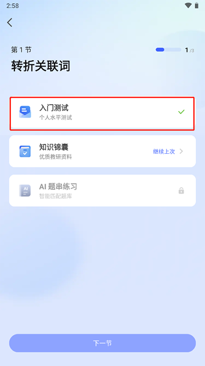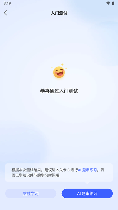 4、软件会根据本次的测试结果来判断是继续学习还是直接进入关卡3进行AI题串练习。