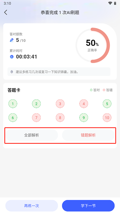 7、完成AI题串练习后,学生可以查看练习的结果,答对的题数,累计耗时,正确率等都可以看得见;当然,我们也可以查看题目的全部解析或者错题解析。