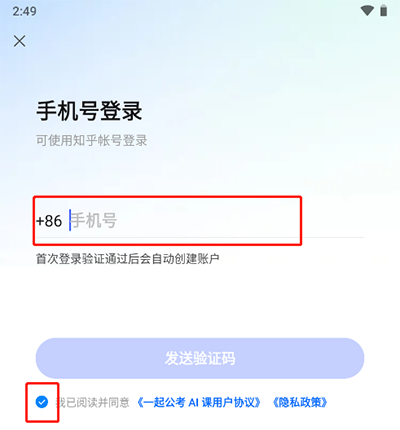 1、我们把软件下载安装好之后,点开就会自动跳到登录页面,输入手机号码,然后勾选下方的我已阅读并同意,点击【发送验证码】,首次登录验证通过后就会自动创建账户;