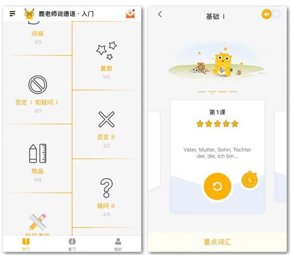 对于初学者来说,标准、清晰的读音尤为重要,这是因为听到的发音是否正确对培养语感会起到关键作用。LingoDeer从数十位录音者中精选最地道最适合初学者的声音,在专业录音室录制,严格控制语速,保证你听到的音频高质、高清、语速合适。我们提供的标准发音贯穿整个学习过程,这就保证了语言熏陶环境。无论是课程学习还是课后练习,只要出现德语的地方都会给到相对应的发音。对于初学者而言,较慢的语速和清晰的发音有助于理解句子的结构,且可反复多次回听,增强记忆印象。