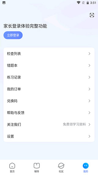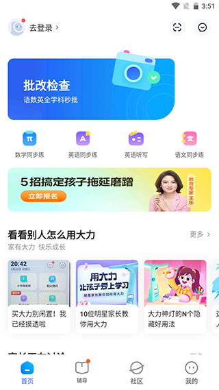 1、下载安装大力家长辅导作业,打开,注册或登录一个账号。