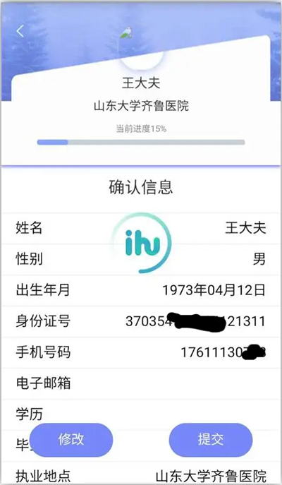 3、【个人信息完善】 定考认证成功后,进入“医师确认信息”页面,逐项核实并完善后,选择“提交”,等待审核通知。