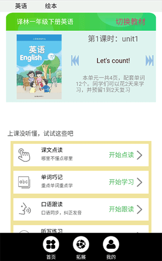 2、点击课本,进入课本详情页,可以进行课本点读,单词巧记,口语跟读,听写练习