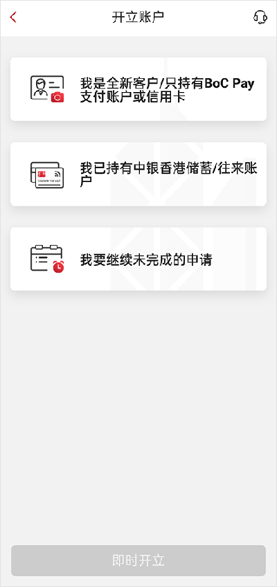 1、首先打开bochk中银香港app最新版,点击开立账户;