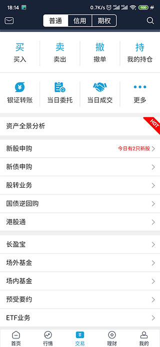 4、在交易板块中有着买入、卖出、撤单、银行转账、当日委托、当日成交等功能,以及资产全景分析:
