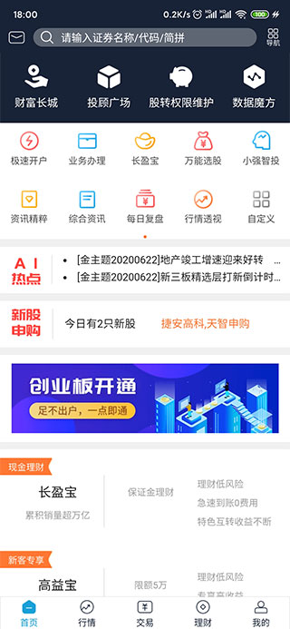 2、然后永辉会看到首页、行情、交易、理财、我的四个板块,在首页中可以极速开户、业务办理、万能选股、小强智投、行情透视、综合资讯、每日复盘等各项功能: