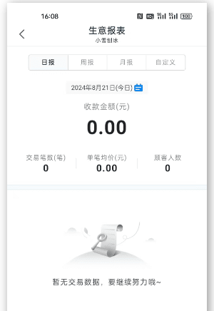 拉卡拉APP首页点击【生意报表】或【全部应用】【生意报表】可至此页面,支持查看按日、周、月或自定义时间范围内的交易汇总数据