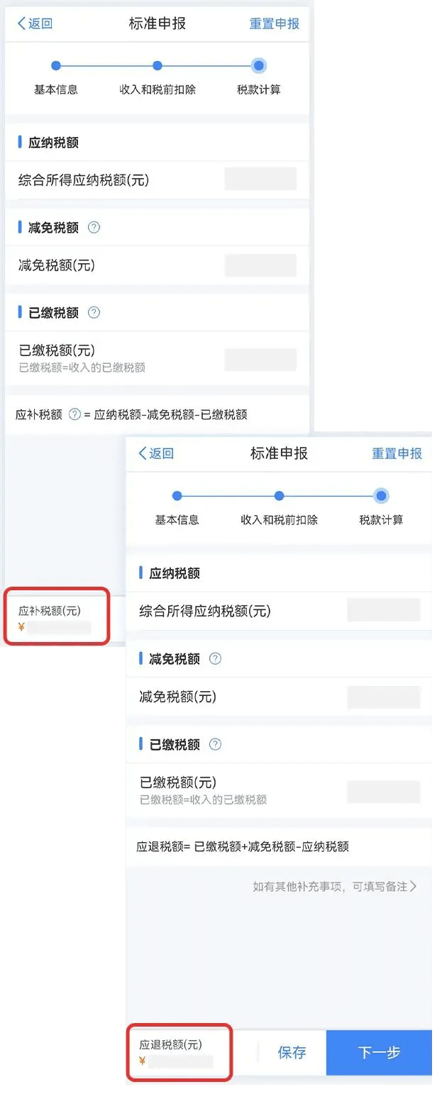(一)系统会根据您填报的信息,自动计算出您的【应补税额】或【应退税额】,并在左下方显示,点击【下一步】。