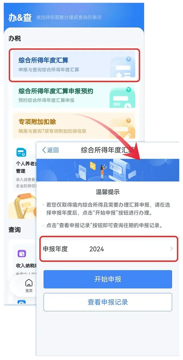 您也可以在首页【办&查】功能中,点击【综合所得年度汇算】,选择申报年度【2024】,进入年度汇算。
