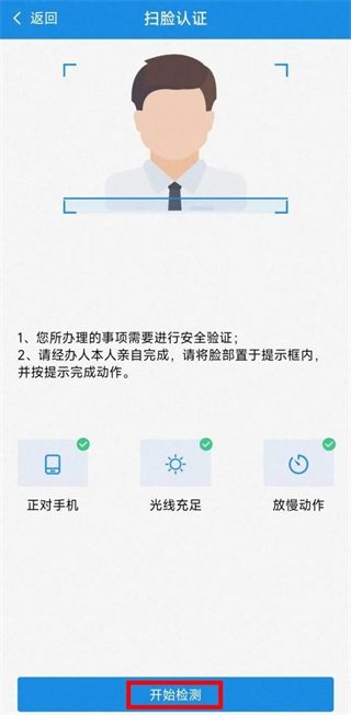 3、进入人脸识别环节。点击“开始检测”,按提示完成动作。认证成功后,进入“查询”界面。