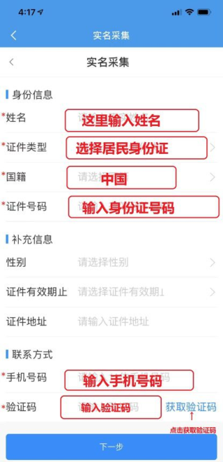 4、在打“*(必填)”的方框内填写个人信息,点击“下一步”