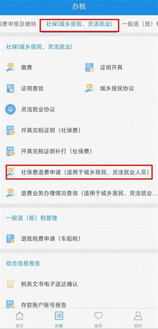 2、进入“办税”界面后,在页面顶端点击“社保(城乡居民、灵活就业)”,在菜单栏里找到“社保费退费申请(适用于城乡居民、灵活就业人员)”。