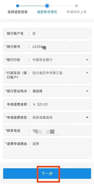 6、退款账号填写。按要求输入或选择相关信息,点击“下一步”。