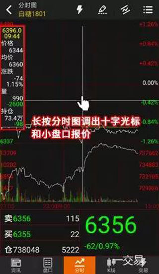 点击合约后默认进入分时走势图,分时走势图可以直观地看出当前价格走势,方便投资者了解当天价格详细走势。同时可以通过点击下方“资讯”“盘口”“K线”“交易”来切换至相关页面。