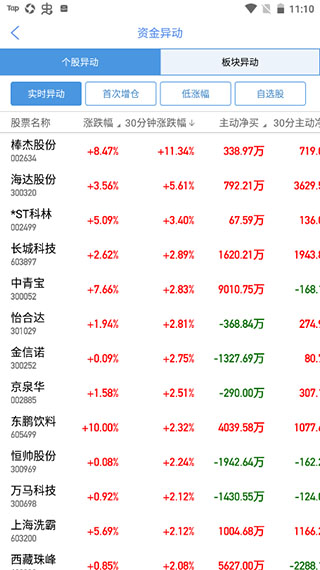 2、点击进入资金异动模块,查看市场异动情况,判断投资