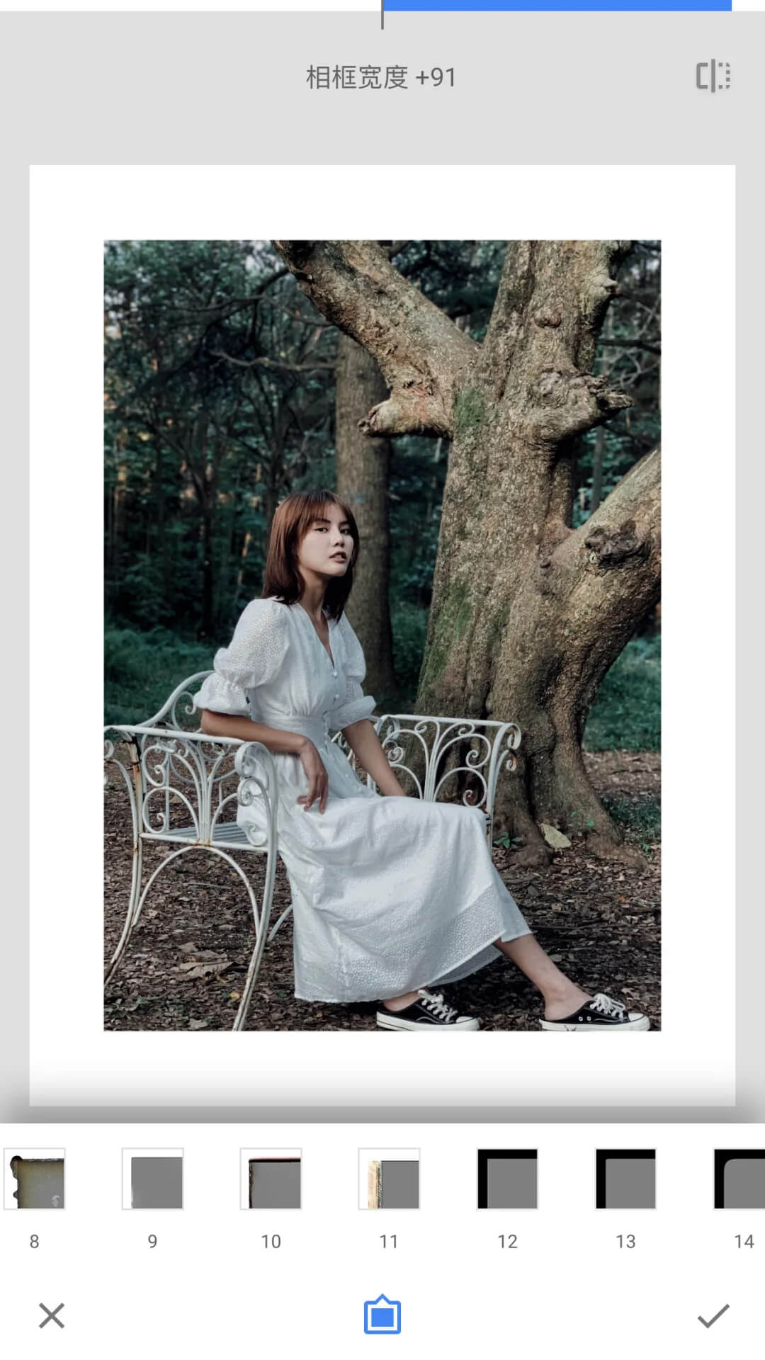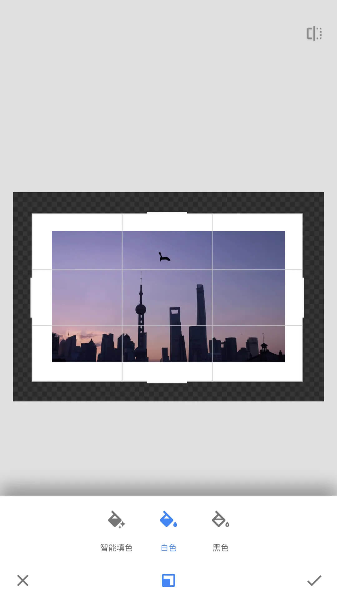 展开:展开中内容与操作并不复杂,它主要作用是可以在构图太满时进行二次修正,以及能更加自由地给照片添加边框(白边框、黑边框)。点击展开框的边缘即可调整展开大小以及范围。双指闭合可以按比例进行调整。展开操作后会进行智能填补。其选择以及使用性跟变形一样,智能填色都要在纯色、有规律或边缘不复杂的画面中展开。