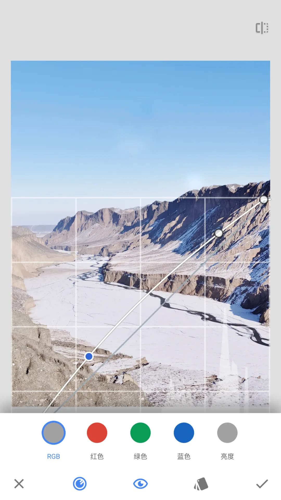 ② RGB曲线:点击底部最左侧菜单,即可看到5条曲线选择的按钮,首先就是RGB曲线,它主要的作用是提亮或压暗画面曝光,提升或降低画面的对比度。可以针对画面全局进行调整,也可以分别针对画面的暗部、中间亮部和亮部进行调整。如果要提升或者压暗整体画面的曝光,只需在曲线的中间打1个锚点,再按住锚点往左上角拉动即可提升整体画面曝光,往右下角拉动,则整体曝光降低。