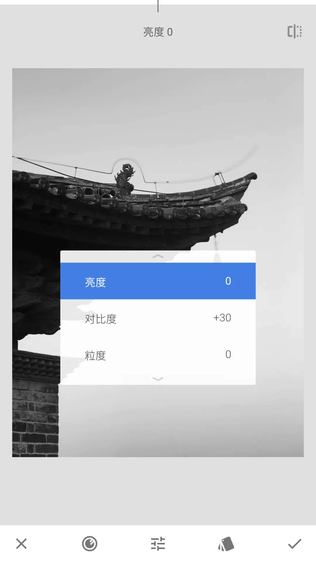 黑白:黑白滤镜能够让照片一键由彩色变为黑白色调,而且有多种黑白色调风格可以选择,对比、明亮、昏暗、胶片等多种风格,能够对亮度、对比度、粒度单独进行调整,是把彩色照片调整为黑白照片的一个最快最直接的方式。