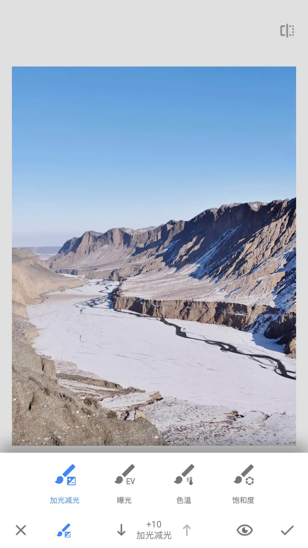 画笔:画笔工具也能对局部区域的曝光和色彩进行调整,主要能够调整4个参数:加光减光、曝光、色温、饱和度,加光减光和曝光都是调整画面的亮度,只不过前者的调整力度要小一些,后者力度更大;色温和饱和度都是调整色彩的两个参数;在底部菜单中间,是调整画笔强度的按钮,通过两个上下“小箭头”来调整。