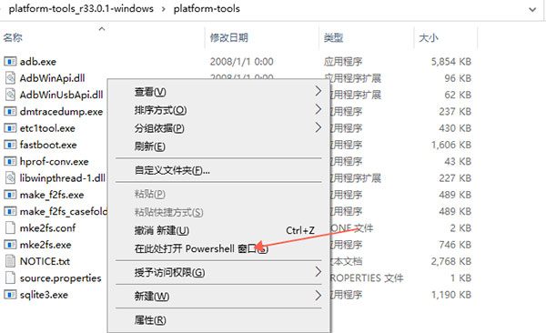 1、首先需要我们下载google的platform-tools工具包,之后按住shift+右键使用管理员权限执行命令行窗口