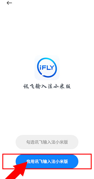 4、再次点击讯飞输入法小米版,进入讯飞输入法设置界面,如下图,可以看到第一步勾选小米输入法已经完成了,我们点击“启用讯飞输入法小米版”