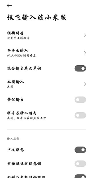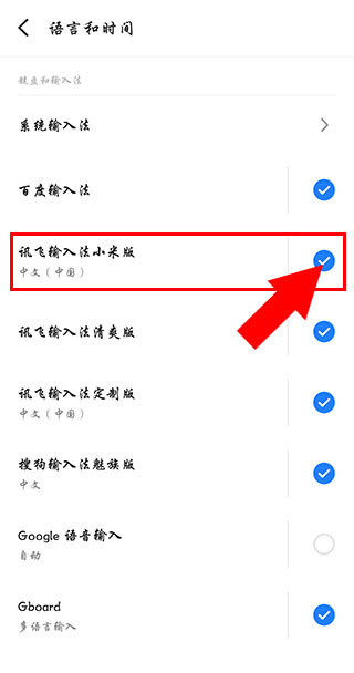 3、在“键盘和输入法”选项下方,点击“讯飞输入法小米版”后方的圆圈勾选讯飞输入法小米定制版
