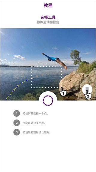 4、擦除运动和稳定:按住屏幕选择一个点,拖动以选择多个点,按垃圾箱图标确认删除;