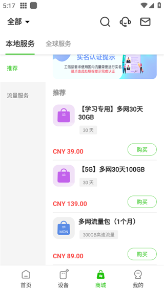 随时在线,畅行无阻!我们新增了“套餐”页面,让购买流量包更加便捷。并新增了5G设备的移动流量,让您出行无忧。