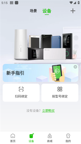 2、进入设备页面,选择“扫码绑定”扫描机身背面二维码或开机扫描屏上二维码对设备进行绑定。