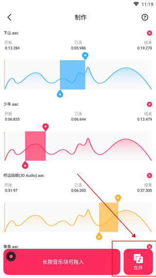 2、【音乐拼接串烧】不同的曲子修剪截取留下需要的部分,然后就像接绳子那样串连起来组合成新的曲子音频。